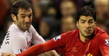 Soccer – Barclays Premier League – Liverpool v Fulham – Anfield By David McIntyre 22/12/2012 Fulham’s Giorgos Karagounis (left) and Liverpool’s Luis Suarez battle for the ball